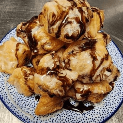 Deep-fried roti bread, topped with sweetened, condensed milk and a delicious chocolate sauce