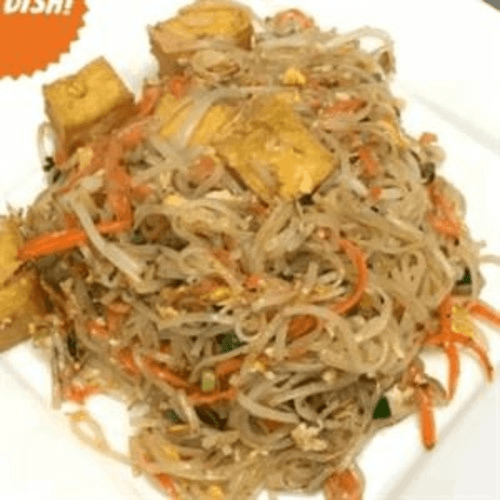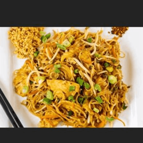 Gluten free. Vegan. Rice noodles, stir-fried in pad Thai sauce with egg, bean sprouts, green onion, and carrot served with peanut