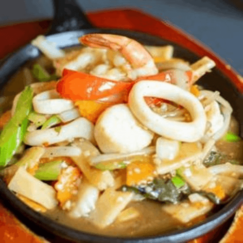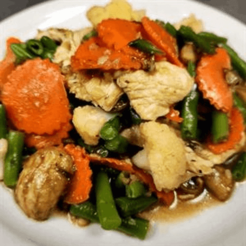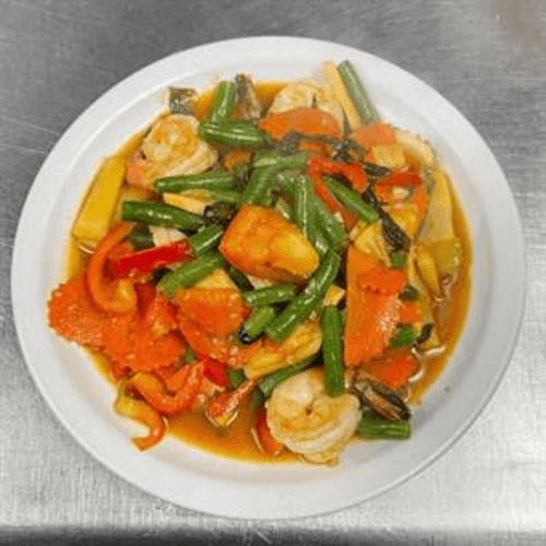 Hot and spicy stir-fry with shrimp, calamari and scallops with bell pepper, onion, celery, bamboo shoots and basil served on hot pan