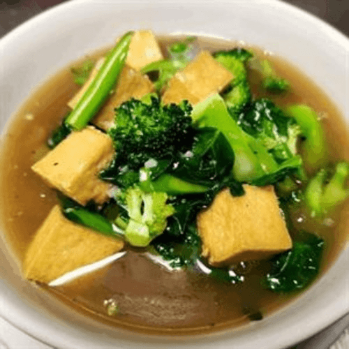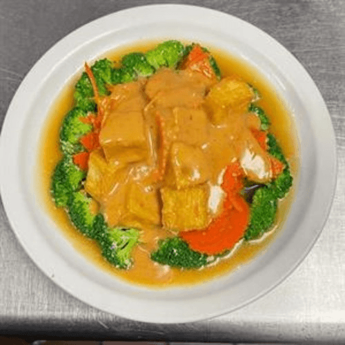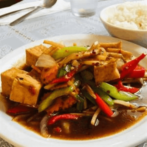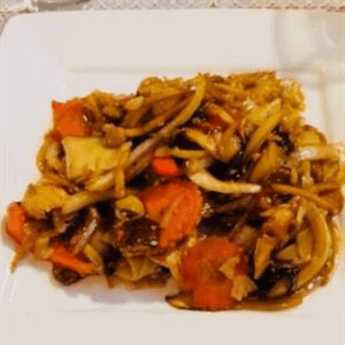 Bell pepper, onion, celery, bamboo shoots, carrot and basil stir-fried with hot chili paste