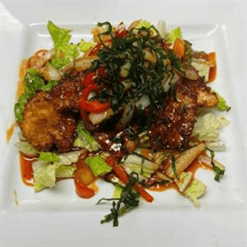 Crispy meat with bell pepper and onion topped with sweet and sour sauce served over fresh lettuce