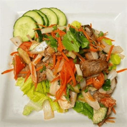 A spicy grilled beef salad with spices, onion, green onion, and cilantro served on fresh lettuce