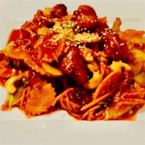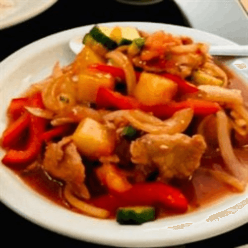 Tomato, bell pepper, onion, cucumber, and pineapple stir-fried with sweet and sour sauce