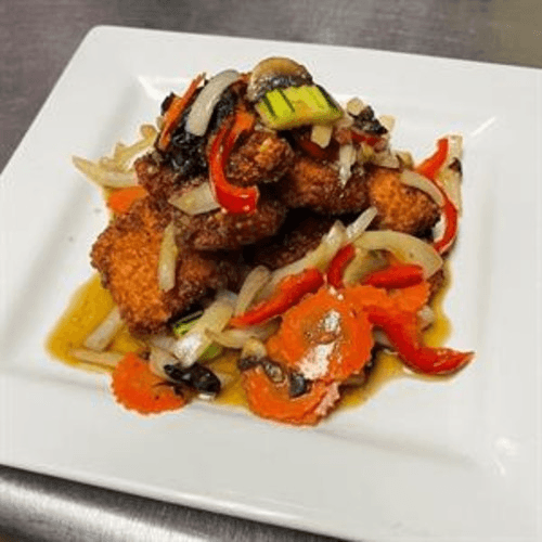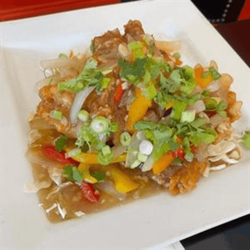 Deep fried batter grouper filet with garlic sauce, onion and bell pepper serve with cabbage, carrot, green onion and cilantro