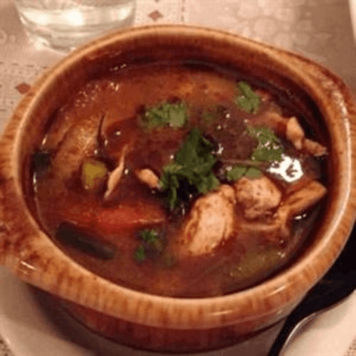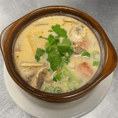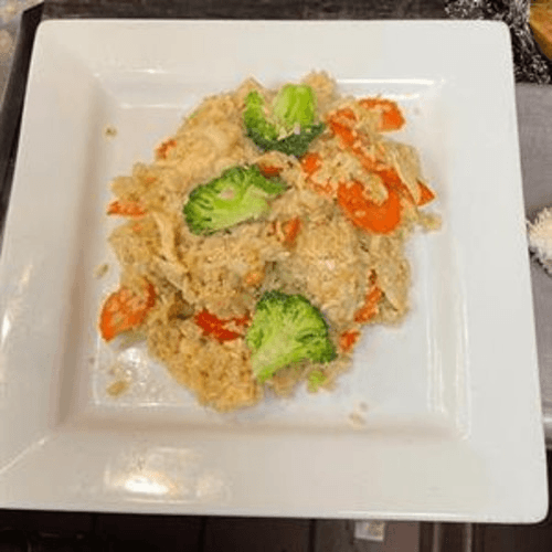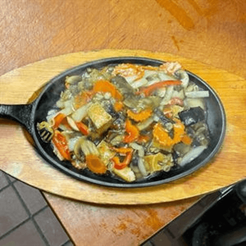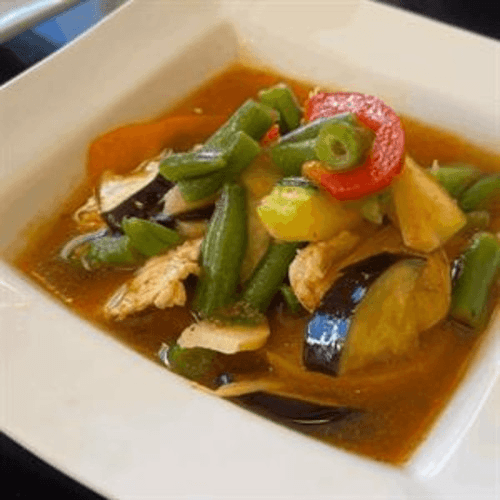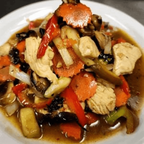 Chicken stir-fried with fresh lemon grass, basil, onion, zucchini, mushroom, egg plant, bell pepper, and carrot served on hot pan