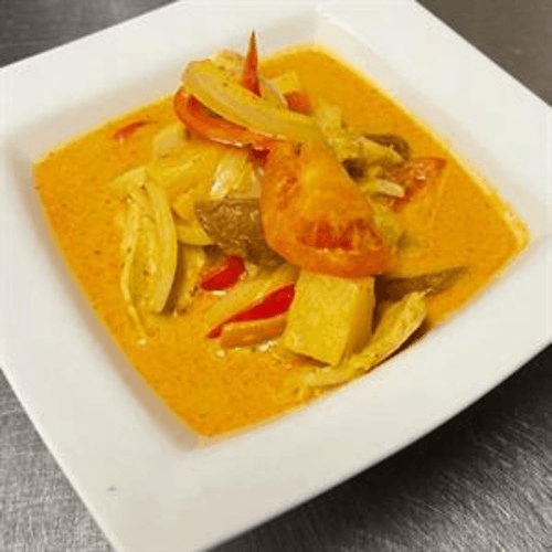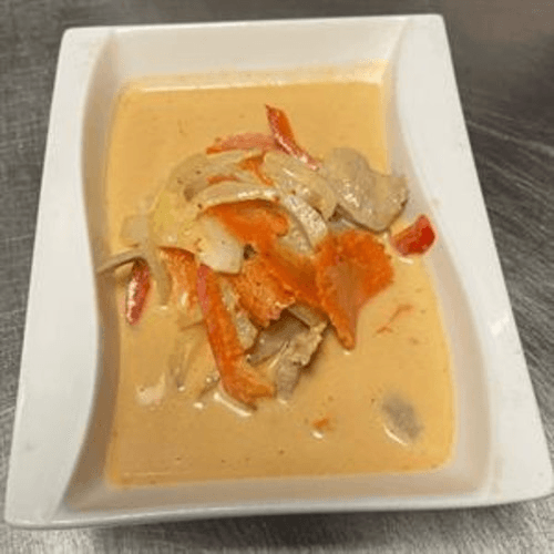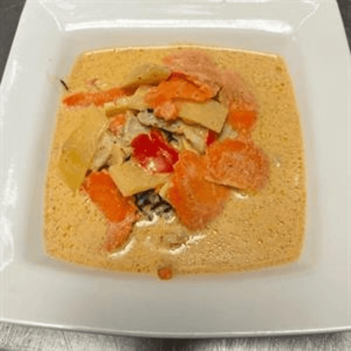 Onion, carrot, and bell pepper in an herbal curry with coconut milk