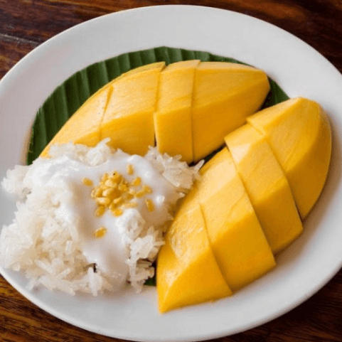 Seasonal special ripe mango serve with warm sweet sticky rice top with coconut sauce and toasted sesame seeds