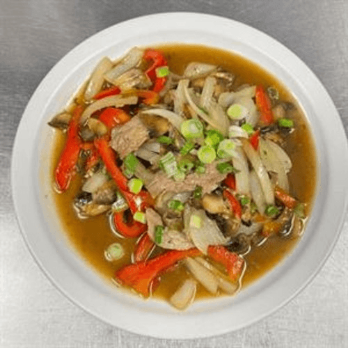 Bell pepper, onion, mushroom, and green onion stir-fried with beef in rich oyster sauce