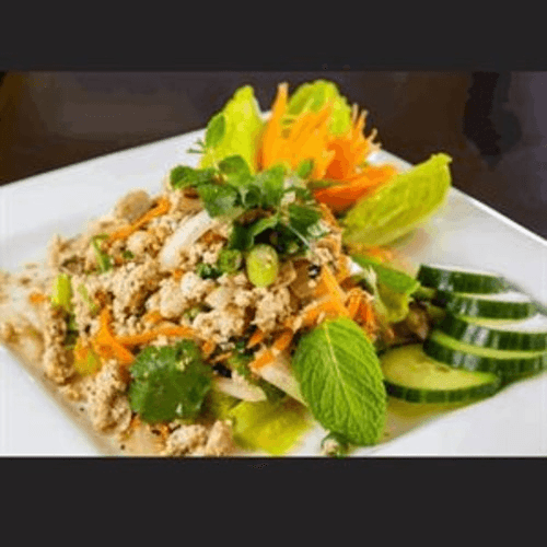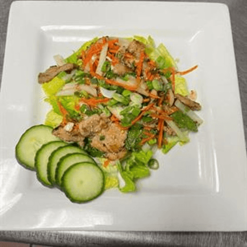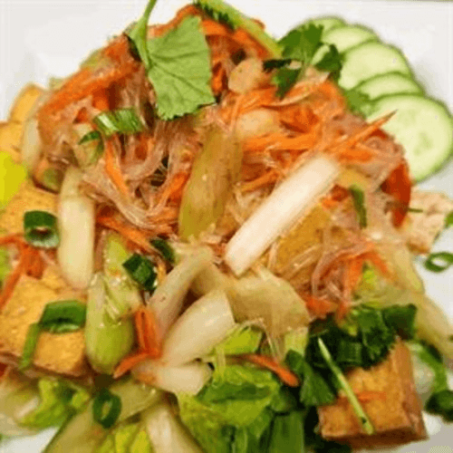 A spicy vermicelli salad with cilantro, tomato, celery, onion and green onion served on fresh lettuce