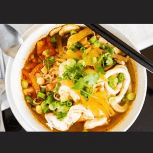 Rice noodles with shrimp, calamari, scallop, tomato, mushroom, green onion, and cilantro in thom yum broth