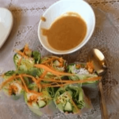 Gluten free. Vegan. Soft rice paper roll filled with rice noodle, chopped lettuce, mint leaves, carrot, cilantro, celery, and cucumber served with peanut sauce