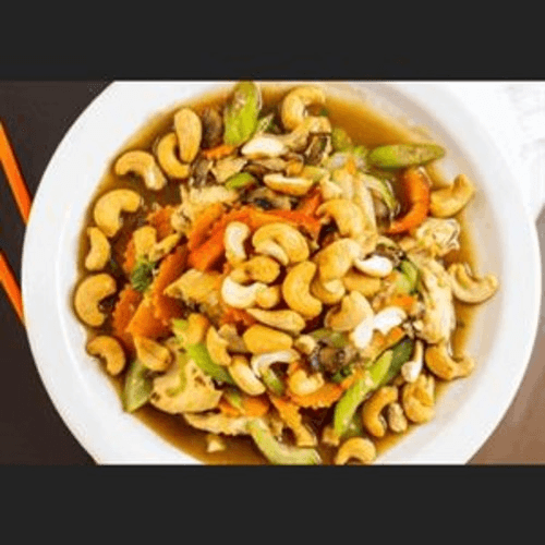 Crispy chicken mixed with cashews, carrot, celery, and green onion in a rich-flavored sauce, topped with sesame seeds