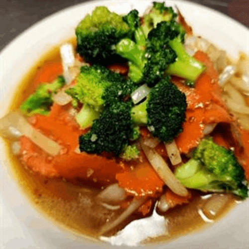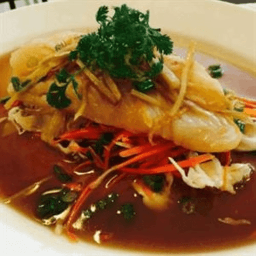 Steam grouper filet with cabbage, carrot, ginger, and celery with special ginger sauce top with green onion and cilantro