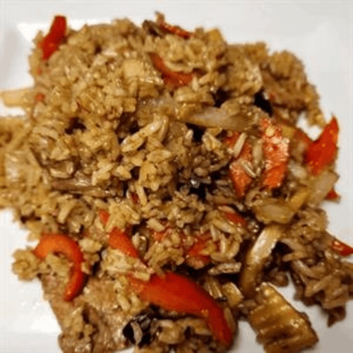 Rice stir-fried with bell pepper, broccoli, carrot, onion, and egg