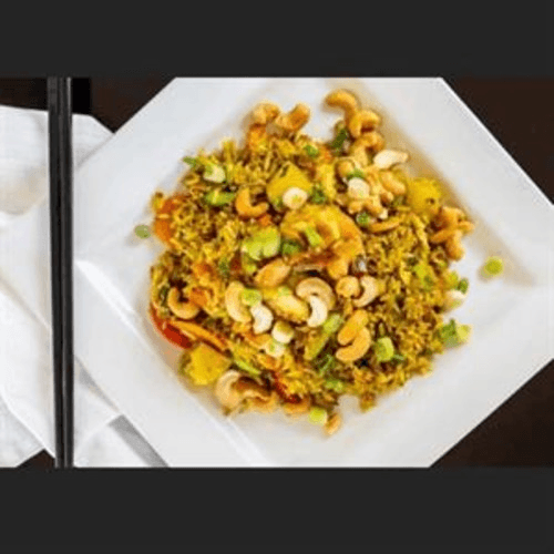 Rice stir-fried with pineapples, green onion, cashew nuts, celery, bell pepper, carrot, and egg with a hint of curry