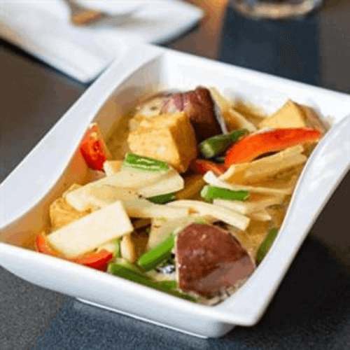 Bamboo shoots, green bean, bell pepper, zucchini, eggplant, and basil in a green curry with coconut milk