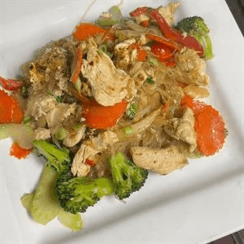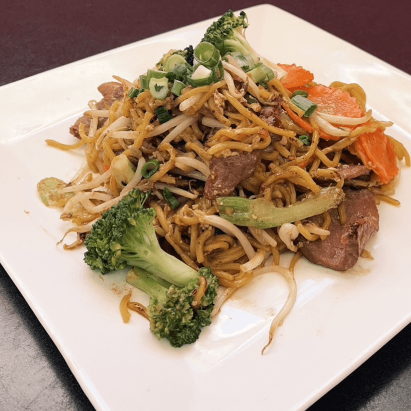 Smoky noodles, stir-fried with egg, bean sprouts, green onion, carrots, celery and broccoli with your choice of protein