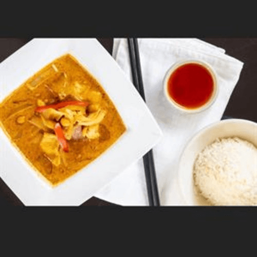 Fried potato,bell pepper, onion, pineapple, and tomato in a yellow curry with coconut milk