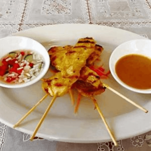 Grill marinated chicken on sticks served with sweet cucumber salad and peanut sauce