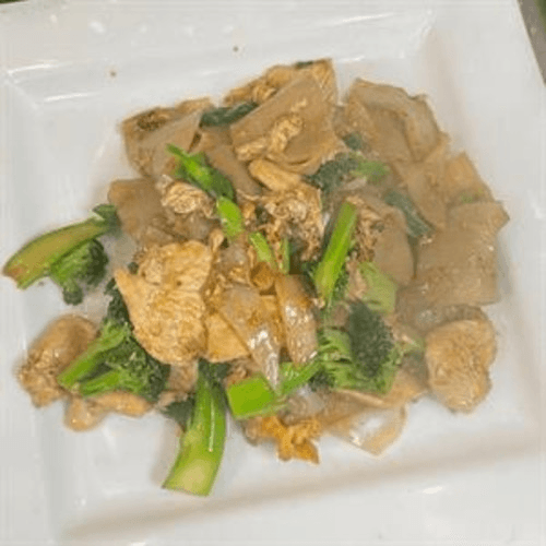 Flat rice noodles, stir-fried with broccoli, kale in brown gravy